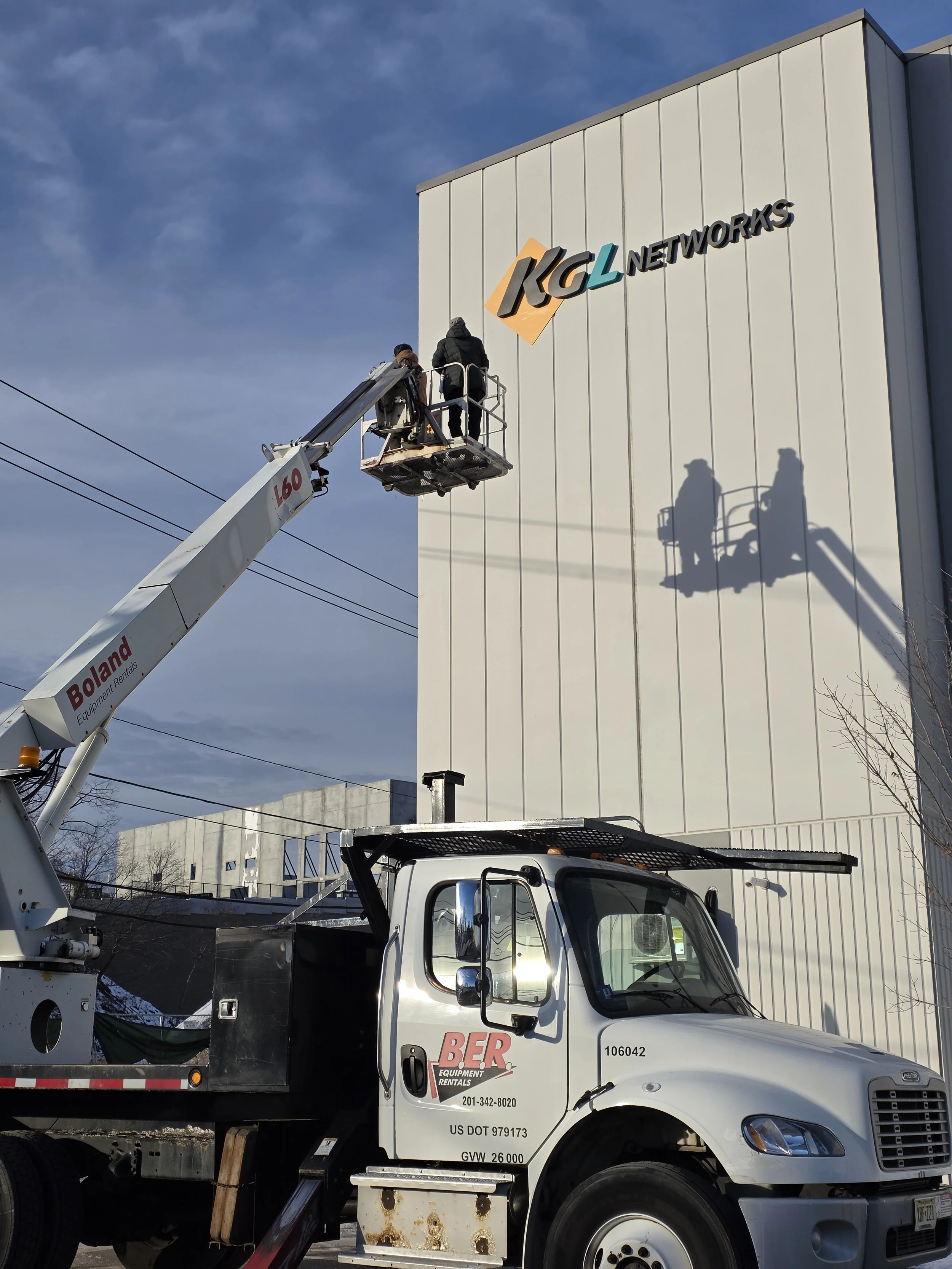 KGL Networks reached out to Sign World for their large new office building in North Arlington. Sign World assisted with getting appropriate permits, fabricating stainless letters and installing high up on the building facade.